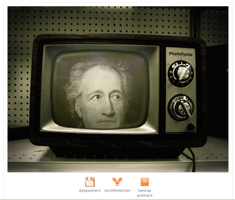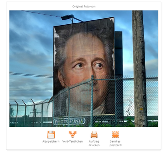 Das von dem PhotoFunia-Bildgenerator erzeugte Foto speichert man entweder auf dem Rechner ab, veröffentlicht es in der Onlinegalerie von PhotoFunia oder verschickt das Bild über einen weiteren Webdienst als Postkarte.